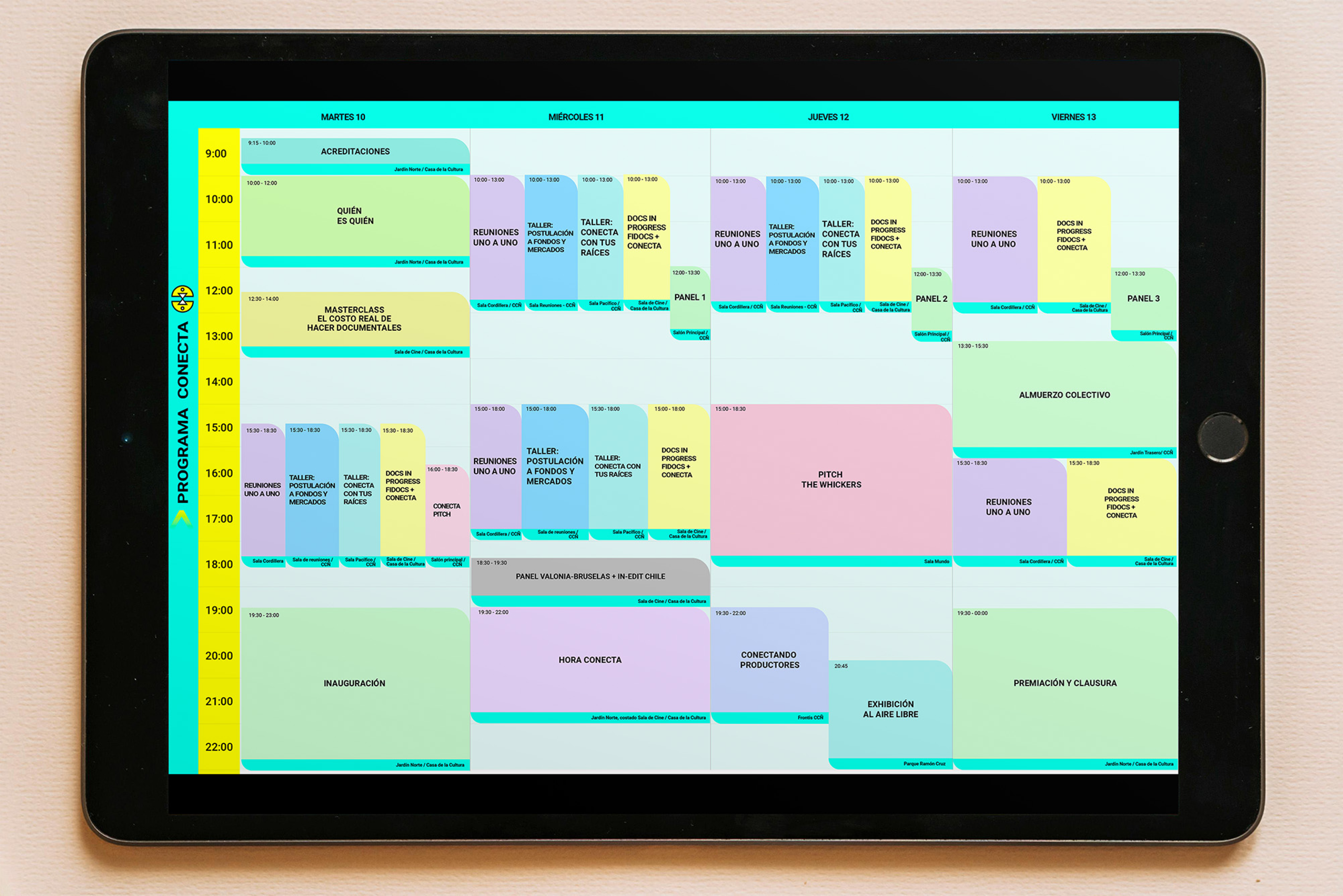 Diseño de programa semanal del encuentro, con horario, lugar y nombre de la actividad.