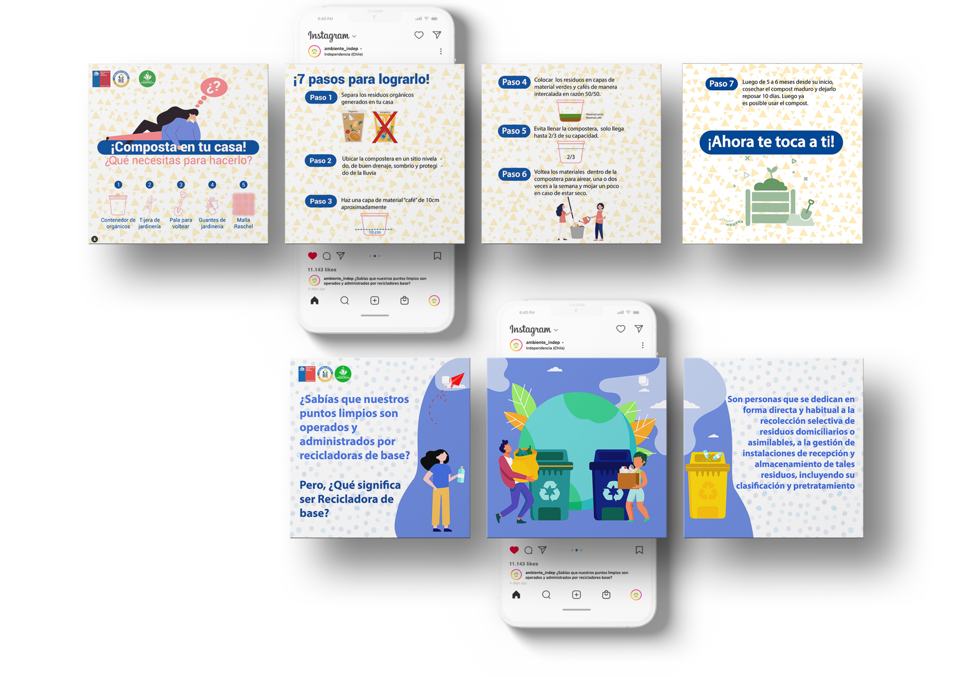 Se realizaron una serie de post tipo carrusel con información relevante para vecinos de la comuna en relación al plan de reciclaje, tanto con información de cómo reciclar, hasta puntos importantes donde dejar residuos dentro de la comuna.