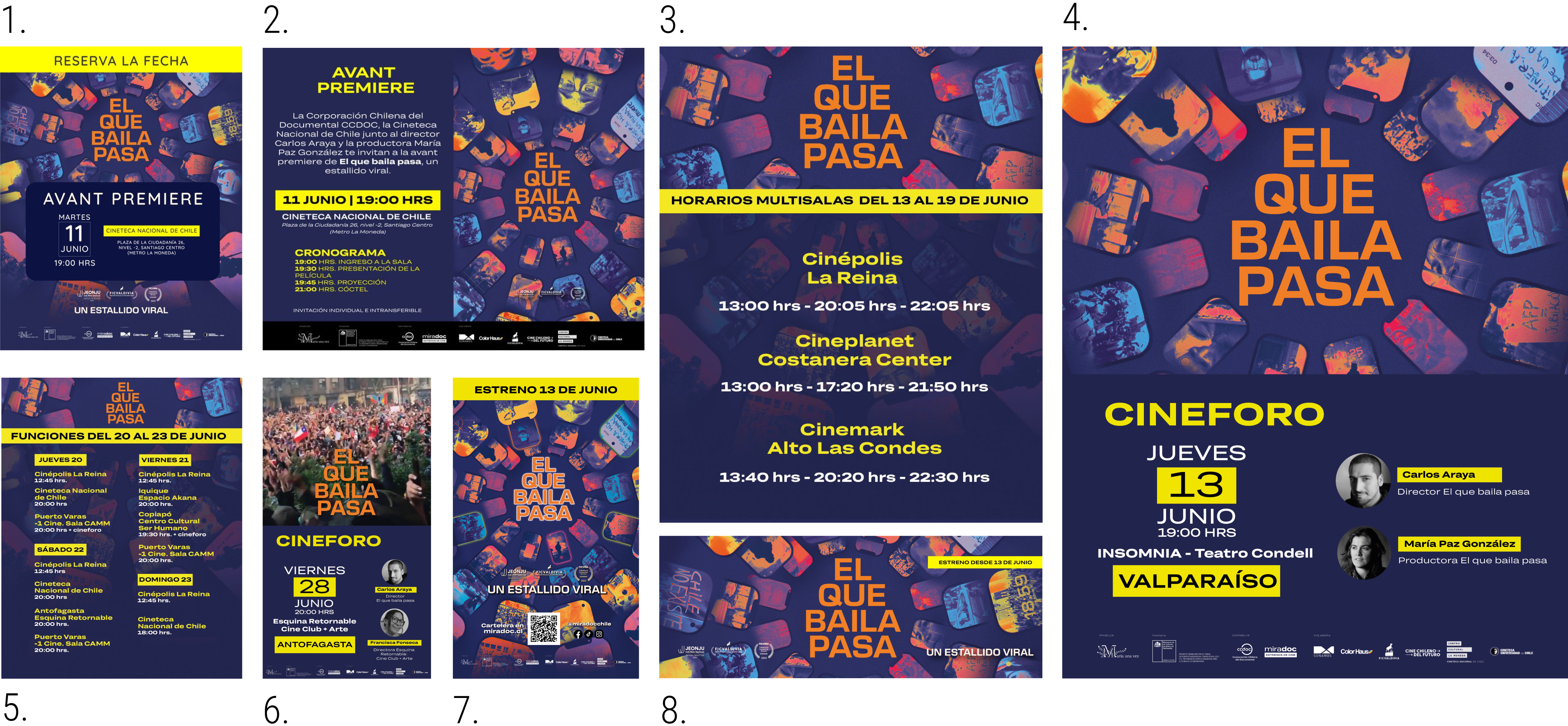 El equipo encargado de las películas que se estrenan entrega el afiche editable de su producción. A partir de este archivo, se desarrollan diversos formatos del afiche para su difusión en distintos medios, tanto impresos como digitales. Estos incluyen invitaciones a funciones especiales, cineforos, standees, publicaciones para redes sociales, páginas web y formatos adaptados a salas de cine independientes y multisalas.