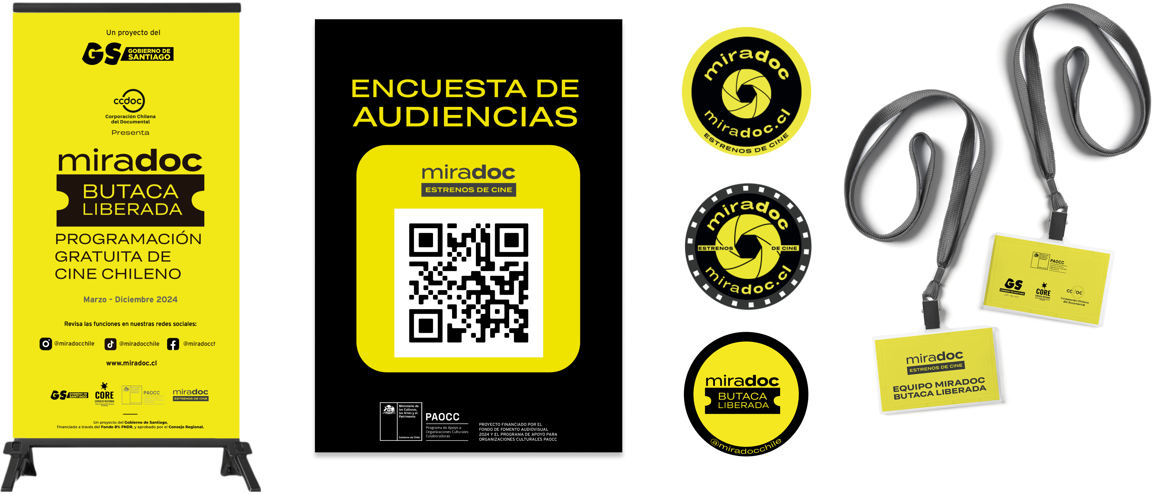 Diseño de piezas coporativas de Miradoc que incluyen pendón tipo roller, afiche con código QR, adhesivos y credenciales.