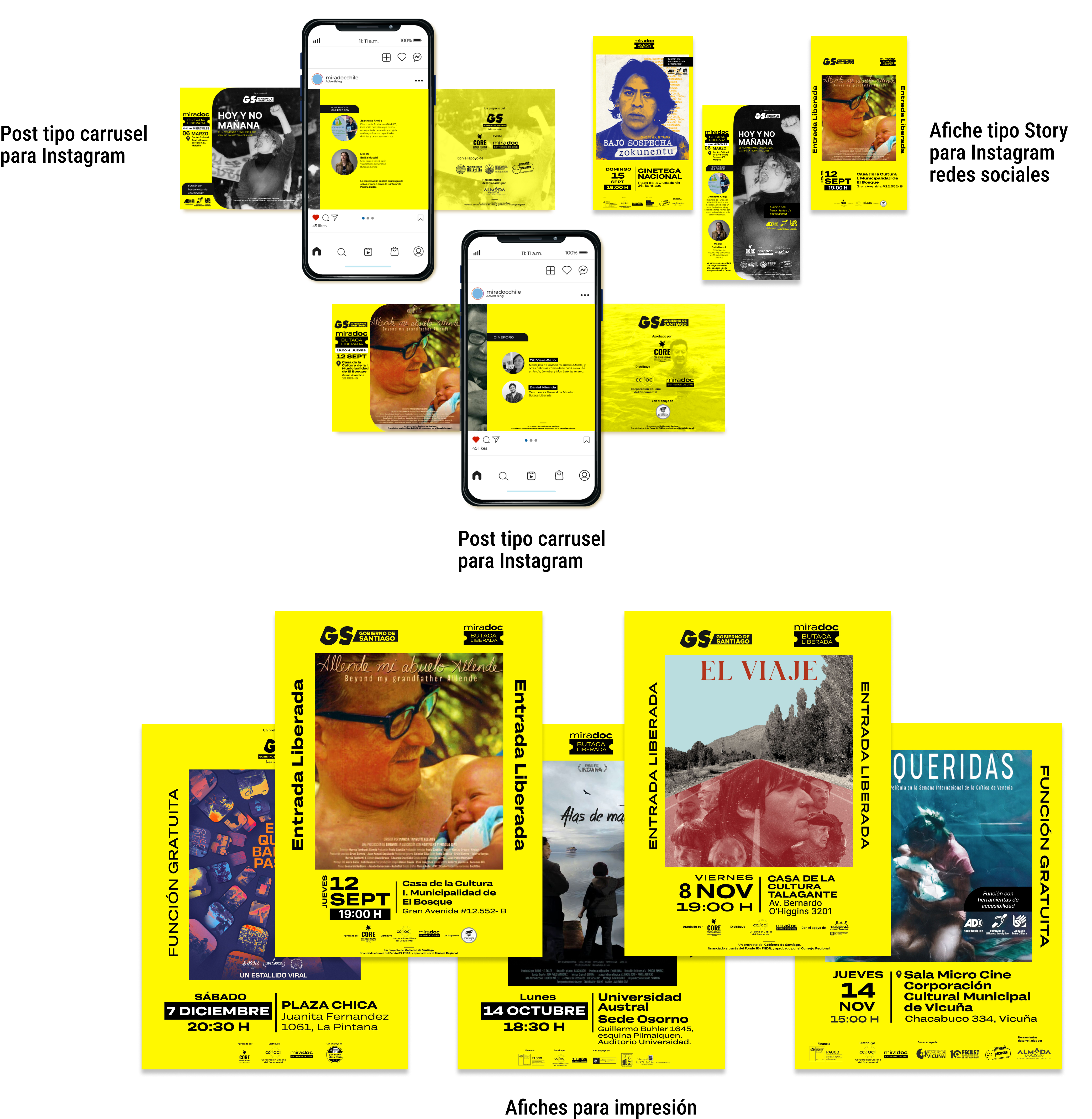 Diseño para redes sociales (post tipo carrusel y formato Story), y afiches impresos de 22 funciones gratuitas de documentales chilenos de Butaca Liberada (CCDOC). Todo de acuerdo al manual de marca de GORE y PAOCC.